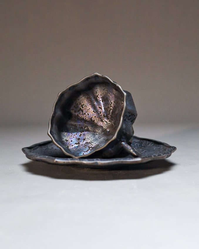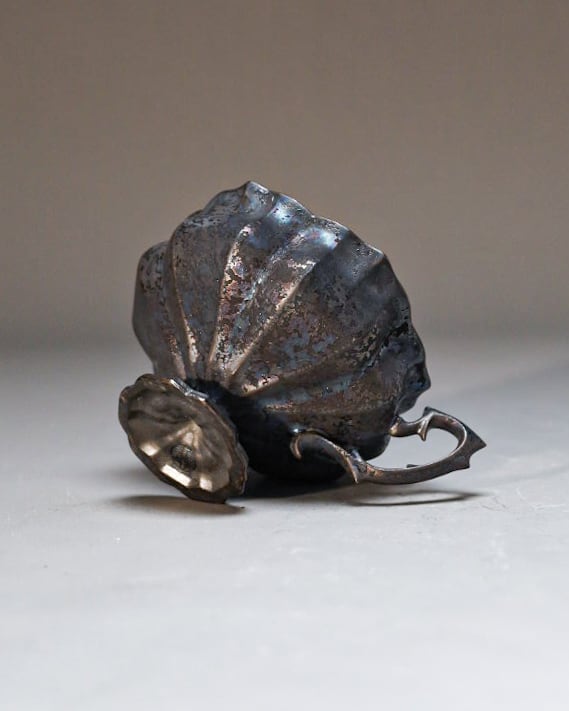 Flora(ラテン語:花)はローマ神話の春と開花の女神に由来し、生命の循環、美の萌芽、季節の移ろいを象徴します。本シリーズは花弁の曲線や蕾の膨らみといった植物がもつ「生成のかたち」を陶で抽象化したもの。開花を思わせる広がりのラインと、静かに閉じる蕾のフォルムを特徴とします。黒煌釉薬は金属質の侘びた黒と七色に光る煌めきが特徴で、相反する陰と陽を共存させています。光にかざすと結晶が色々な色に輝きます。